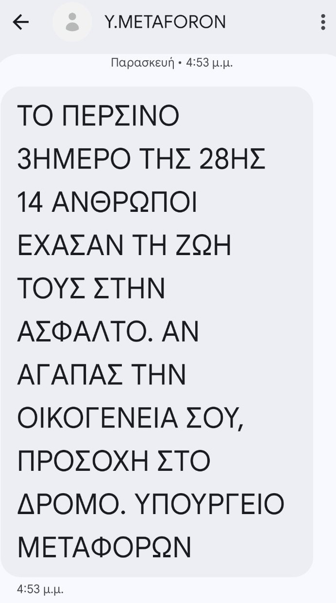 Το μήνυμα έγραφε: «Το περσινό 3ήμερο της 28ης 14 άνθρωποι έχασαν τη ζωή τους στην άσφαλτο. Αν αγαπάς την οικογένειά σου, προσοχή στο δρόμο. Υπουργείο Μεταφορών».