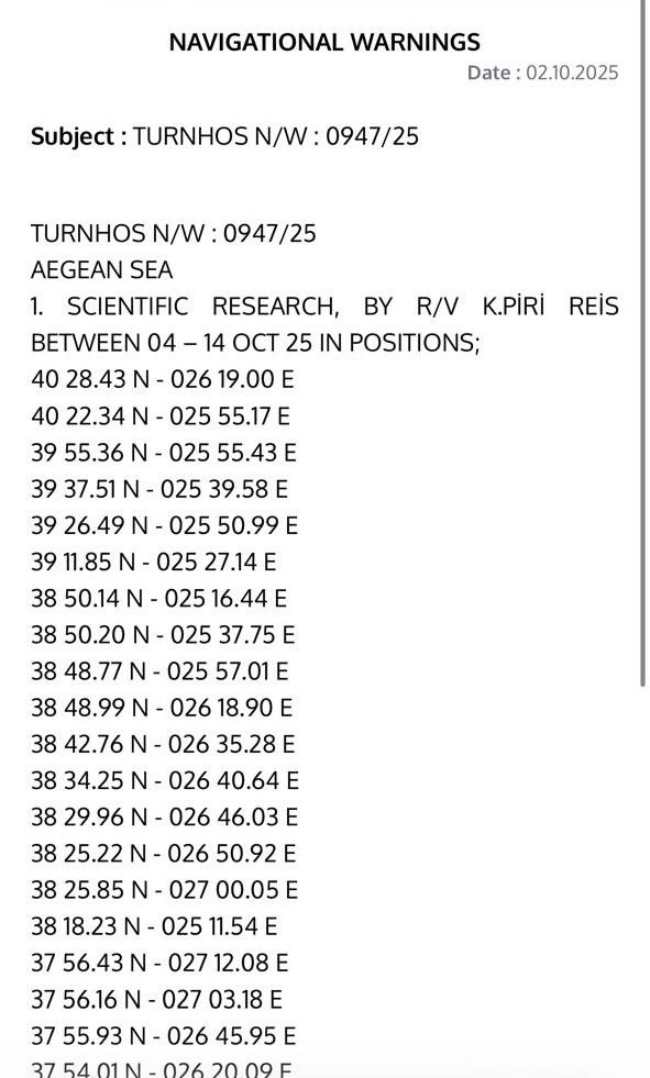 Η Navtex που εξέδωσε η υδρογραφική υπηρεσία Σμύρνnς του τουρκικού Πολεμικού Ναυτικού, αναφέρει ότι το Piri Reis, θα βγεί από τις 4 έως τις 14 Οκτωβρίου για έρευνες στο Αιγαίο με κατεύθυνση δυτικά της Χίου και της Μυτιλήνης.