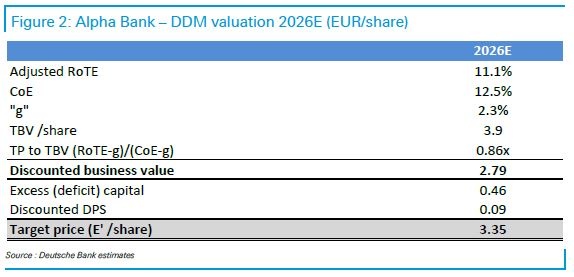 Η Deutsche Bank επιβεβαιώνει τη σύσταση «Αγορά» για τη μετοχή της Alpha Bank και αυξάνει τον στόχο τιμής στα 3,35 ευρώ, από 3,00 ευρώ στο προηγούμενο report, υποδεικνύοντας περιθώριο ανόδου 18%.