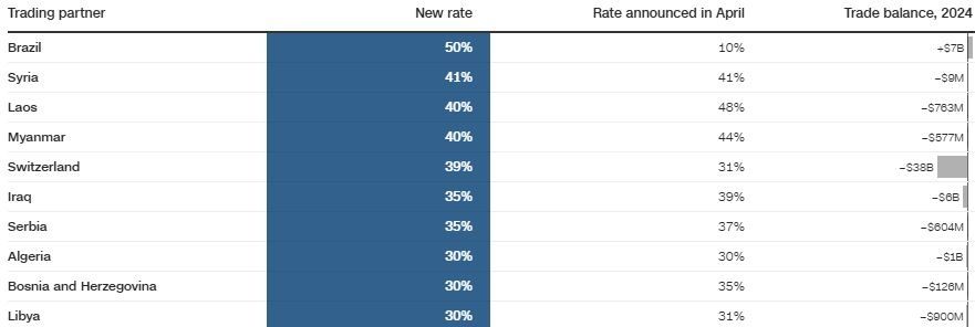 Ωστόσο, δεν ήταν όλες οι χώρες τόσο «τυχερές». Σε διεθνές επίπεδο, οι χώρες που επιβαρύνονται με τους υψηλότερους δασμούς είναι η Βραζιλία (50%), το Λάος και η Μυανμάρ με 40%. Η Ελβετία με 39% και η Σερβία 35%.