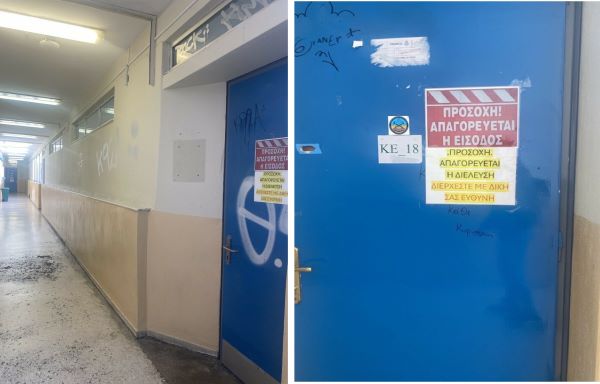 Οι εικόνες μιλούν από μόνες τους: τρεις κλειδωμένες αίθουσες, προειδοποιητικές ταμπέλες και απαγορευτικές κορδέλες στην είσοδο της γραμματείας των τμημάτων στο κτίριο των Κοίλων, που παραπέμπουν περισσότερο σε “σκηνή εγκλήματος” παρά σε ανώτατο εκπαιδευτικό ίδρυμα. Αντί για επιστημονική γνώση και έρευνα, μας προσφέρεται ανασφάλεια και πλήρης υποβάθμιση των σπουδών μας. Μάλλον από τις περιβόητες φιέστες με την πολεμική βιομηχανία που έγιναν πρόσφατα δεν περίσσεψαν χρήματα για να γίνουν έστω και αυτές οι μικροεπισκευές.