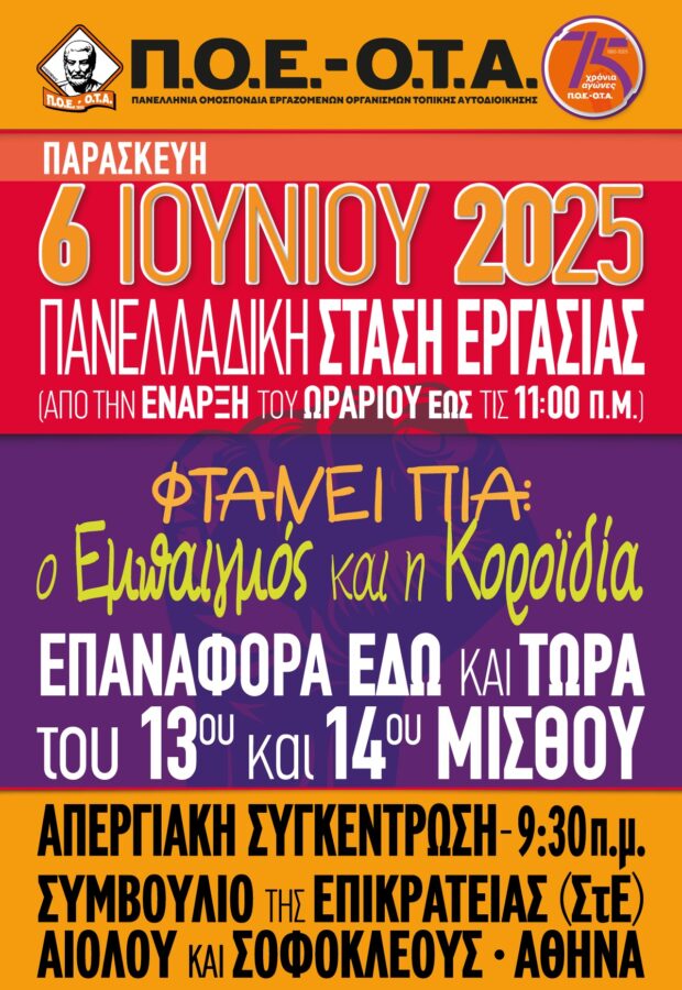 Η Εκτελεστική Επιτροπή της Α.Δ.Ε.Δ.Υ., με αφορμή τη διεξαγωγή της πρότυπης δίκης για την επαναφορά του 13ου και 14ου μισθού στο Δημόσιο που διεξάγεται στο ΣτΕ στις 6 Ιουνίου 2025, κηρύσσει Πανελλαδική Στάση Εργασίας την ίδια μέρα από την έναρξη του ωραρίου έως τις 11:00πμ και καλεί στους εργαζόμενους του Λεκανοπεδίου στο Δημόσιο να δώσουν το «παρών» στη συγκέντρωση διαμαρτυρίας που θα γίνει έξω από το ΣτΕ, στις 9:30πμ (Αιόλου και Σοφοκλέους).