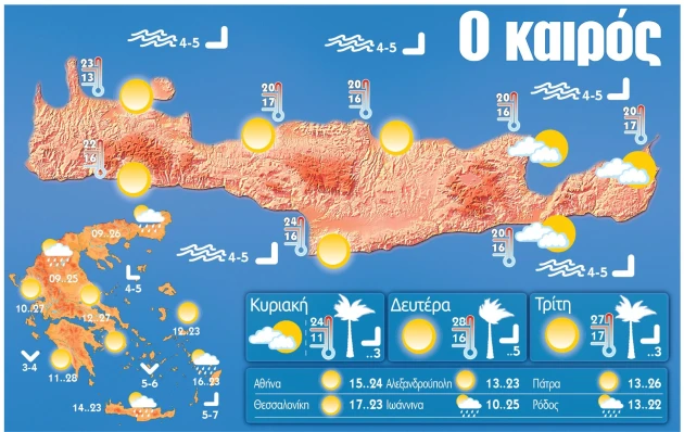 Η θερμοκρασία θα κυμανθεί από 15 έως 20 ή 21 βαθμούς Κελσίου, ενώ στη νότια Κρήτη τοπικά θα φτάσει έως και τους 23 βαθμούς.