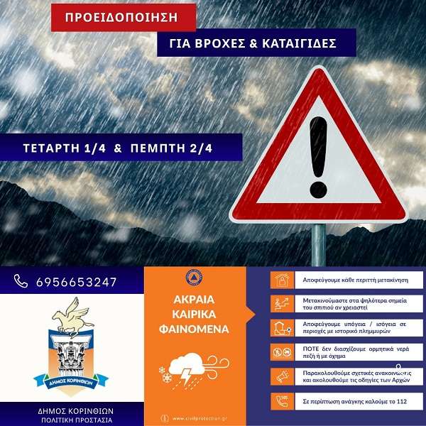 🚨 Σε κατάσταση επιφυλακής ο Δήμος Κορινθίων λόγω κακοκαιρίας