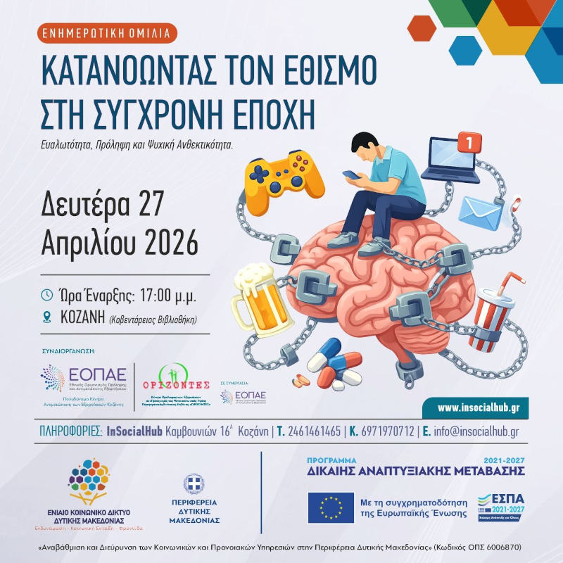 Ενημερωτική ομιλία με θέμα «Κατανοώντας τον Εθισμό στη Σύγχρονη Εποχή: Ευαλωτότητα, Πρόληψη και Ψυχική Ανθεκτικότητα» διοργανώνεται τη Δευτέρα 27 Απριλίου 2026 στις 17:00 στην Κοβεντάρειο Βιβλιοθήκη Κοζάνης.