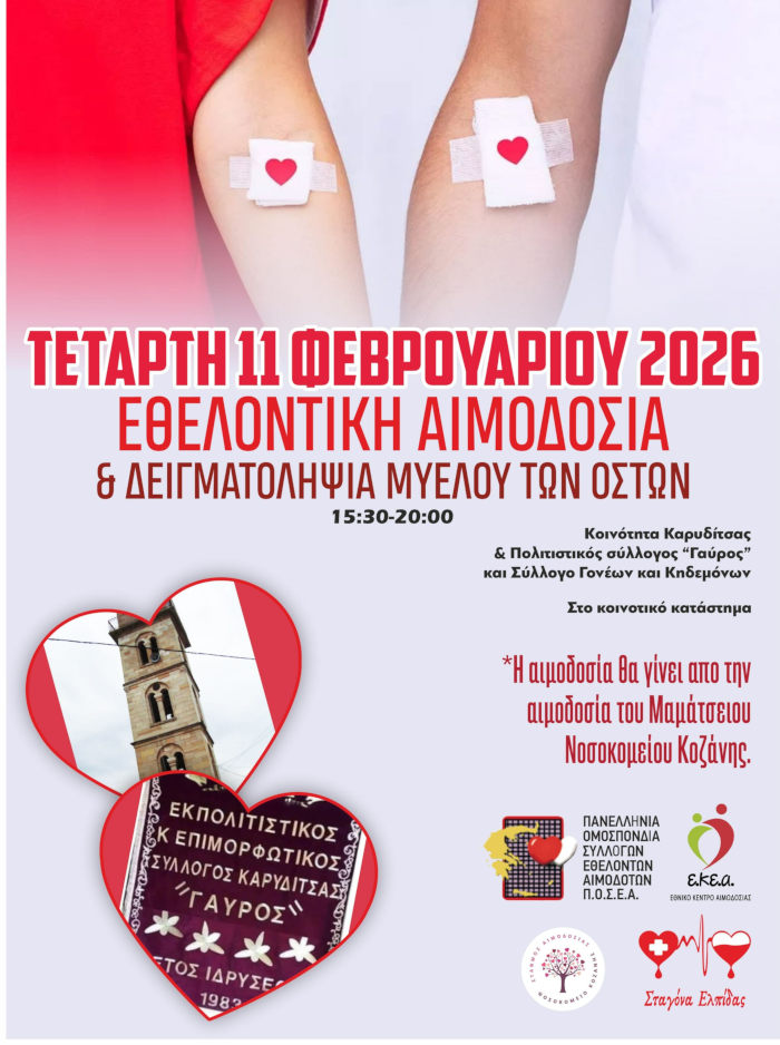 Στην Καρυδίτσα, με τον Πολιτιστικό Συλλόγο “Γαύρος με τον Σύλλογο Γονέων κηδεμόνων του σχολείου μας, και η Κοινότητα μαζί με την Σταγόνα Ελπίδας και την Αιμοδοσία Μαμάτσειου Νοσοκομείου Κοζάνης την Τετάρτη 11 Φεβρουαρίου δίνουμε αίμα, γινόμαστε εθελοντές δότες μυελού οστών την Τετάρτη 11 Φεβρουαρίου στην αίθουσα του πνευματικού κέντρου από 3+30 έως 19+30 ( ώρα προσέλευσης).