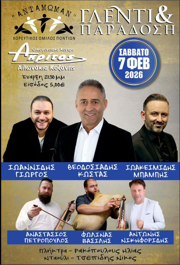 Ο Χορευτικός Όμιλος Ποντίων «ΑΝΤΑΜΩΜΑΝ» διοργανώνει τον Ετήσιο Χορό του το Σάββατο, 7 Φεβρουαρίου 2026, στο Οικογενειακό Κέντρο «Ακρίτας» στα Αλωνάκια Κοζάνης.
