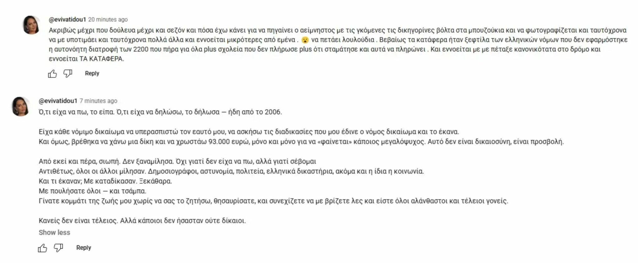 Σε άλλο σημείο σημειώνει: «Ό,τι είχα να πω, το είπα. Ό,τι είχα να δηλώσω, το δήλωσα, ήδη από το 2006. Είχα κάθε νόμιμο δικαίωμα να υπερασπιστώ τον εαυτό μου, να ασκήσω τις διαδικασίες που μου έδινε ο νόμος δικαίωμα και το έκανα. Και όμως, βρέθηκα να χάνω μια δίκη και να χρωστάω 93.000 ευρώ, μόνο και μόνο για να “φαίνεται” κάποιος μεγαλόψυχος. Αυτό δεν είναι δικαιοσύνη, είναι προσβολή.