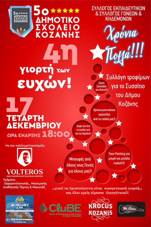 Η εκδήλωση πραγματοποιείται με τη στήριξη της σχολής VOLTEROS, καθώς και επιχειρήσεων της πόλης, οι οποίες στέκονται αρωγοί στη συγκεκριμένη πρωτοβουλία και στηρίζουν έμπρακτα τη σχολική κοινότητα. Το 5ο Δημοτικό Σχολείο Κοζάνης απευθύνει ανοιχτό κάλεσμα σε γονείς, μαθητές και πολίτες να συμμετάσχουν στη γιορτή, ανταλλάσσοντας ευχές και υπενθυμίζοντας ότι τα Χριστούγεννα είναι πάνω απ’ όλα γιορτή αγάπης, προσφοράς και συντροφικότητας.