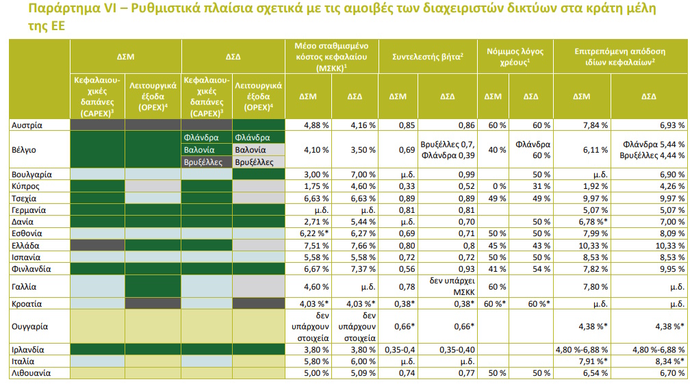 Σύμφωνα με νέα έκθεση του Ελεγκτικού Συνεδρίου της ΕΕ, τα στοιχεία για τα τελευταία έτη έδειξαν ότι Ελλάδα και Πολωνία προσφέρουν το υψηλότερο μέσο σταθμισμένο κόστος κεφαλαίου, δηλαδή το λεγόμενο WACC. Στην περίπτωση του ΑΔΜΗΕ το ποσοστό ήταν 7,51%, ενώ στον ΔΕΔΔΗΕ 7,66%.