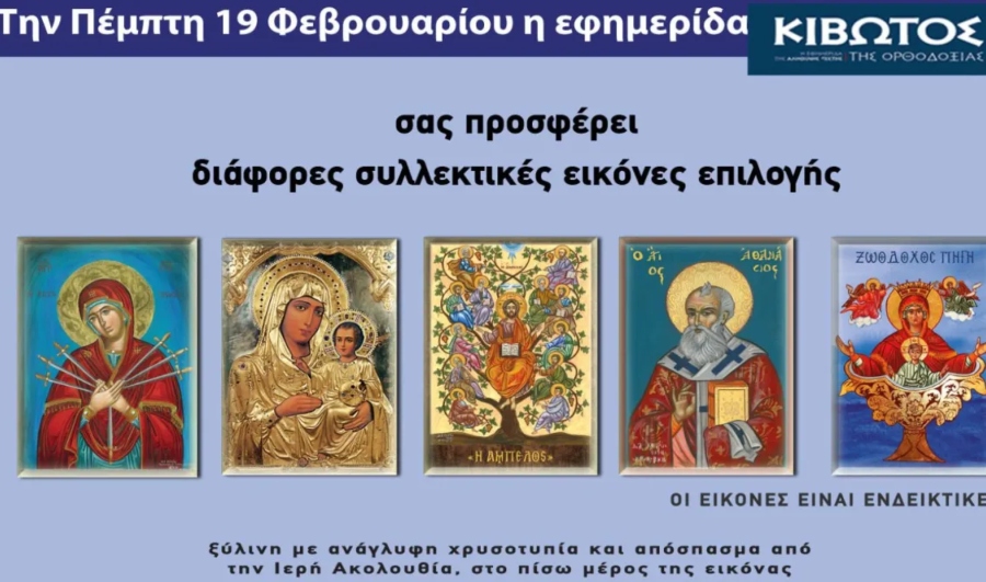 Την Πέμπτη 19 Φεβρουαρίου η εφημερίδα Κιβωτός της Ορθοδοξίας κατόπιν μεγάλης ζήτησης, επανακυκλοφορεί ολόκληρη την Συλλογής της και κάθε εβδομάδα σας προσφέρει πολλές αγαπημένες εικόνες για να επιλέξετε.