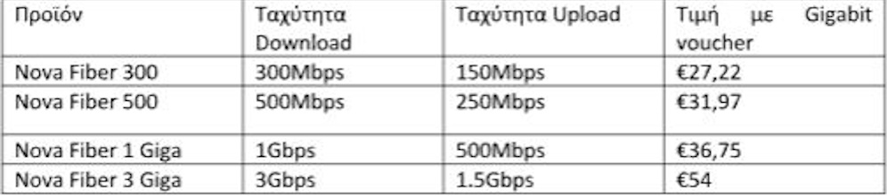 Με τις τιμές να ξεκινούν από τα 27,22 ευρώ / μήνα με κουπόνι Gigabit Voucher, η Nova προσφέρει τις εξής επιλογές για σύνδεση οπτικών ινών: