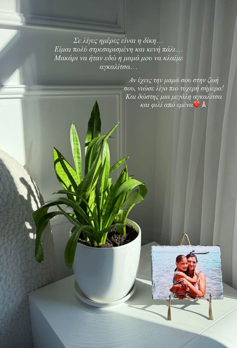 Στο τέλος της ανάρτησής της, απηύθυνε μια τρυφερή προτροπή στους διαδικτυακούς της φίλους: «Αν έχεις τη μαμά σου στη ζωή σου, νιώσε λίγο πιο τυχερή σήμερα και δώσ’ της μια μεγάλη αγκαλιά και ένα φιλί από εμένα».