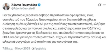 «Για το χθεσινό εξαιρετικά σοβαρό περιστατικό σφάλματος, ενός νοσηλευτού του Τζανείου Νοσοκομείου, όταν διαπιστώθηκε χθες η Διοίκηση αμέσως διέταξε ΕΔΕ για τις συνθήκες του περιστατικού, κλήθηκε ο εισαγγελεύς για το ποινικό σκέλος και εγώ ζήτησα από τον ΟΔΙΠΥ να ξεκινήσει έρευνα για τις διαδικασίες που ακολουθεί το νοσοκομείο και το ΕΚΕΑ να διερευνήσει το περιστατικό. Εύχομαι περαστικά στην ασθενή και ειλικρινή συγγνώμη από αυτήν και την οικογένεια της», ανέφερε ο κ. Γεωργιάδης σε χθεσινή ανάρτησή του στο «Χ».