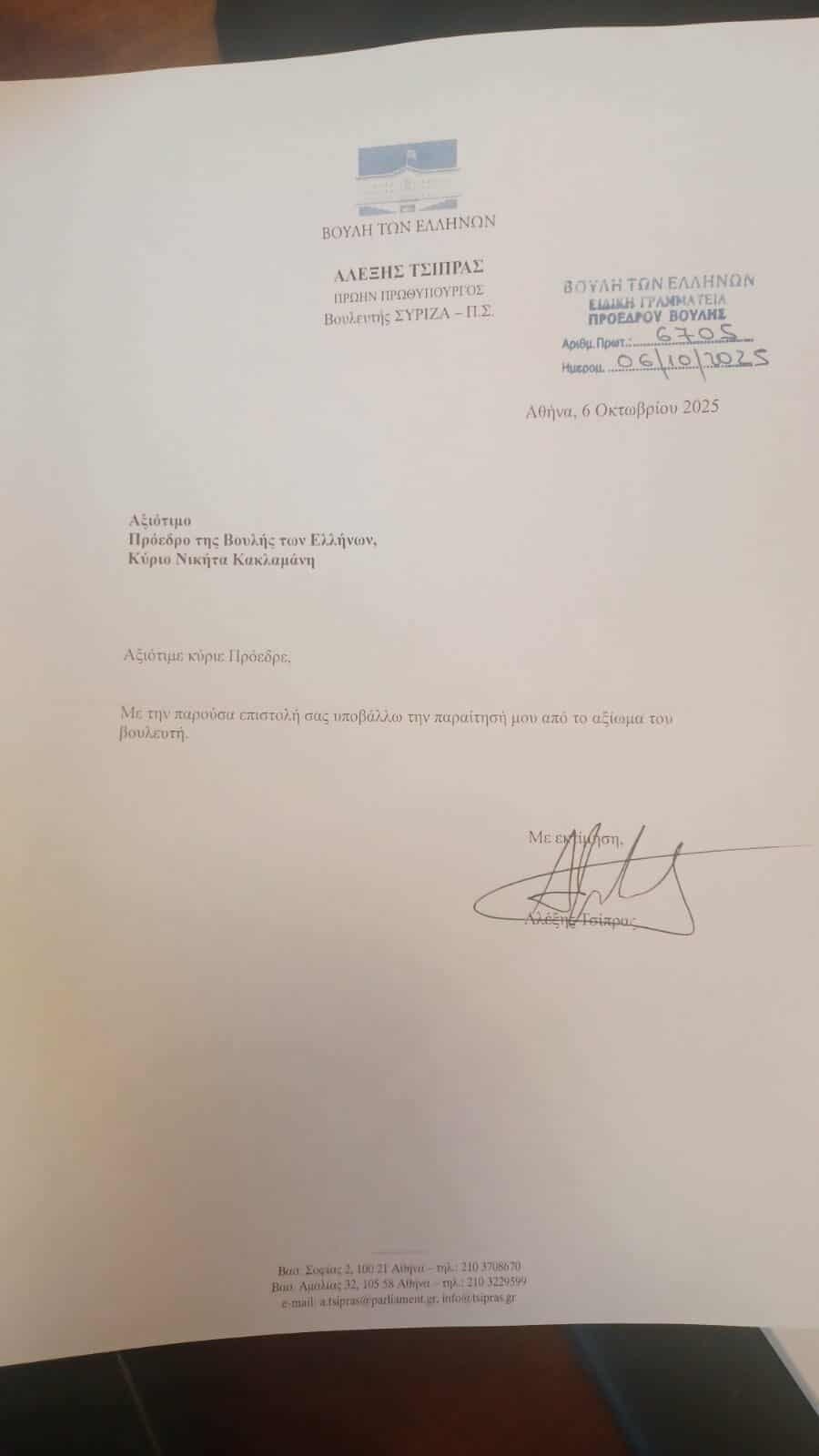Παραιτήθηκε ο Αλέξης Τσίπρας από βουλευτής του ΣΥΡΙΖΑ – «Δεν παραιτούμαι από την πολιτική δράση»