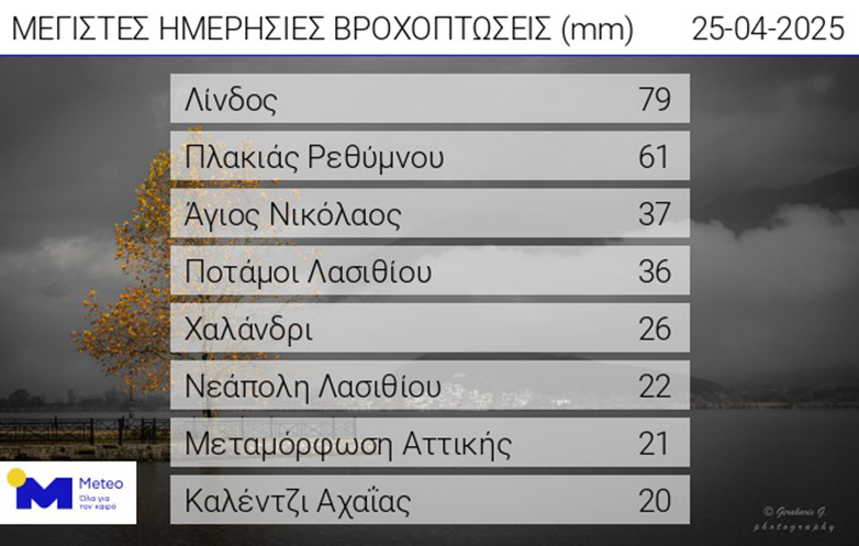 Στον παρακάτω πίνακα παρουσιάζονται τα 8 μεγαλύτερα ύψη βροχής έως τις 18:10 της Παρασκευής (25/04).