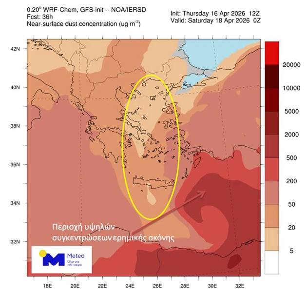 Όπως σημείωσε ο κ. Λαγουβάρδος, «στον χάρτη που παρατίθεται, από το μοντέλο DUST/METEO του Εθνικού Αστεροσκοπείου Αθηνών, παρουσιάζεται η προβλεπόμενη συγκέντρωση της σκόνης τις βραδινές ώρες της Παρασκευής 17/04. Μέσα στο Αιγαίο αλλά και στην Κρήτη, οι ισχυροί βόρειοι άνεμοι περιορίζουν σημαντικά τις συγκεντρώσεις σκόνης (περιοχή εντός της κίτρινης έλλειψης), ενώ υψηλές συγκεντρώσεις σκόνης προβλέπονται στα νοτιοανατολικά, αλλά ευτυχώς κυρίως σε θαλάσσιες περιοχές», ενώ, όπως σημείωσε, από σήμερα Σάββατο «η σκόνη απομακρύνεται σχεδόν εντελώς από τη χώρα μας».