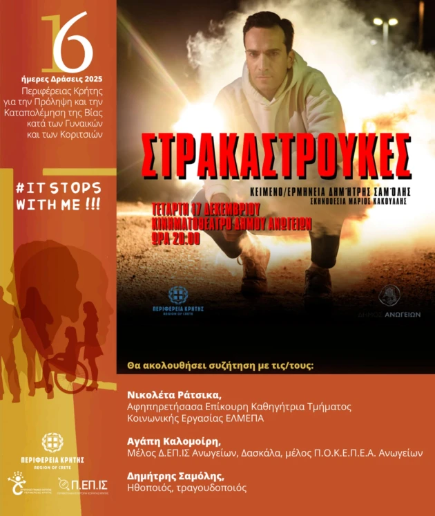 Η θεατρική παράσταση «Στρακαστρούκες», με το Δημήτρη Σαμόλη, που γνωρίζει μεγάλη επιτυχία στην Αθήνα για τη βαθιά συγκινητική και κοινωνικά αιχμηρή ματιά της, έρχεται στην Κρήτη και σφραγίζει με τον πιο ουσιαστικό και συμβολικό τρόπο τις «16ήμερες Δράσεις της Περιφέρειας Κρήτης για την Πρόληψη και την Αντιμετώπιση της Βίας κατά των Γυναικών και των Κοριτσιών». Η παράσταση φωτίζει ζητήματα κακοποίησης, κοινωνικού αποκλεισμού και σιωπής μέσα στην κλειστή κοινωνία της επαρχίας και αναδεικνύει τη δύναμη της τέχνης ως μέσο ευαισθητοποίησης, ενδυνάμωσης και κοινωνικής αλλαγής.