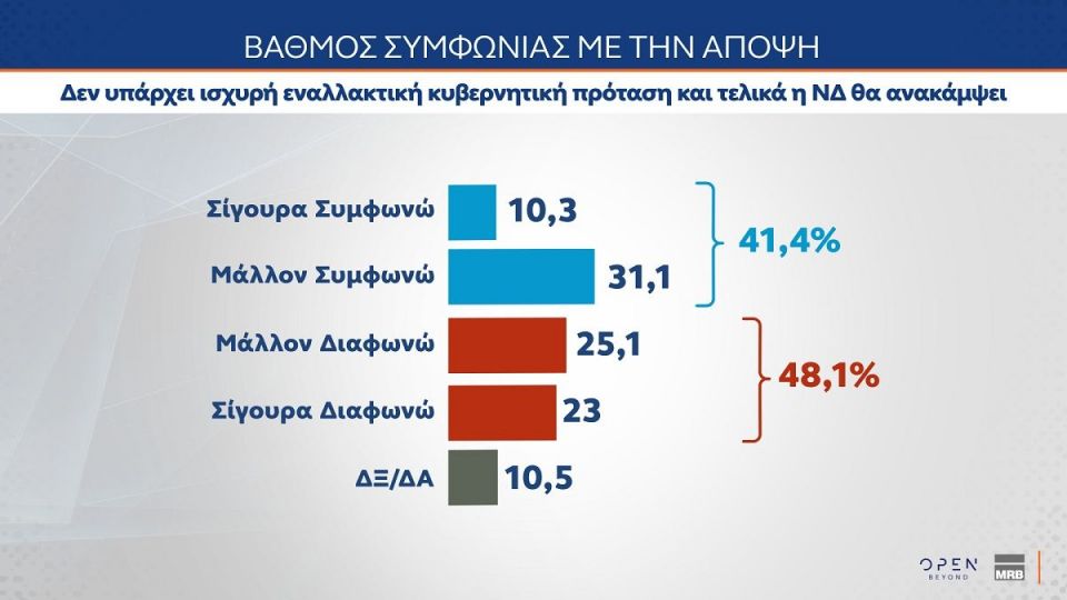 Με την άποψη ότι δεν υπάρχει ισχυρή κυβερνητική πρόταση και τελικά η ΝΔ θα ανακάμψει διαφωνεί το 48,1% ενώ συμφωνεί το 41,4%.